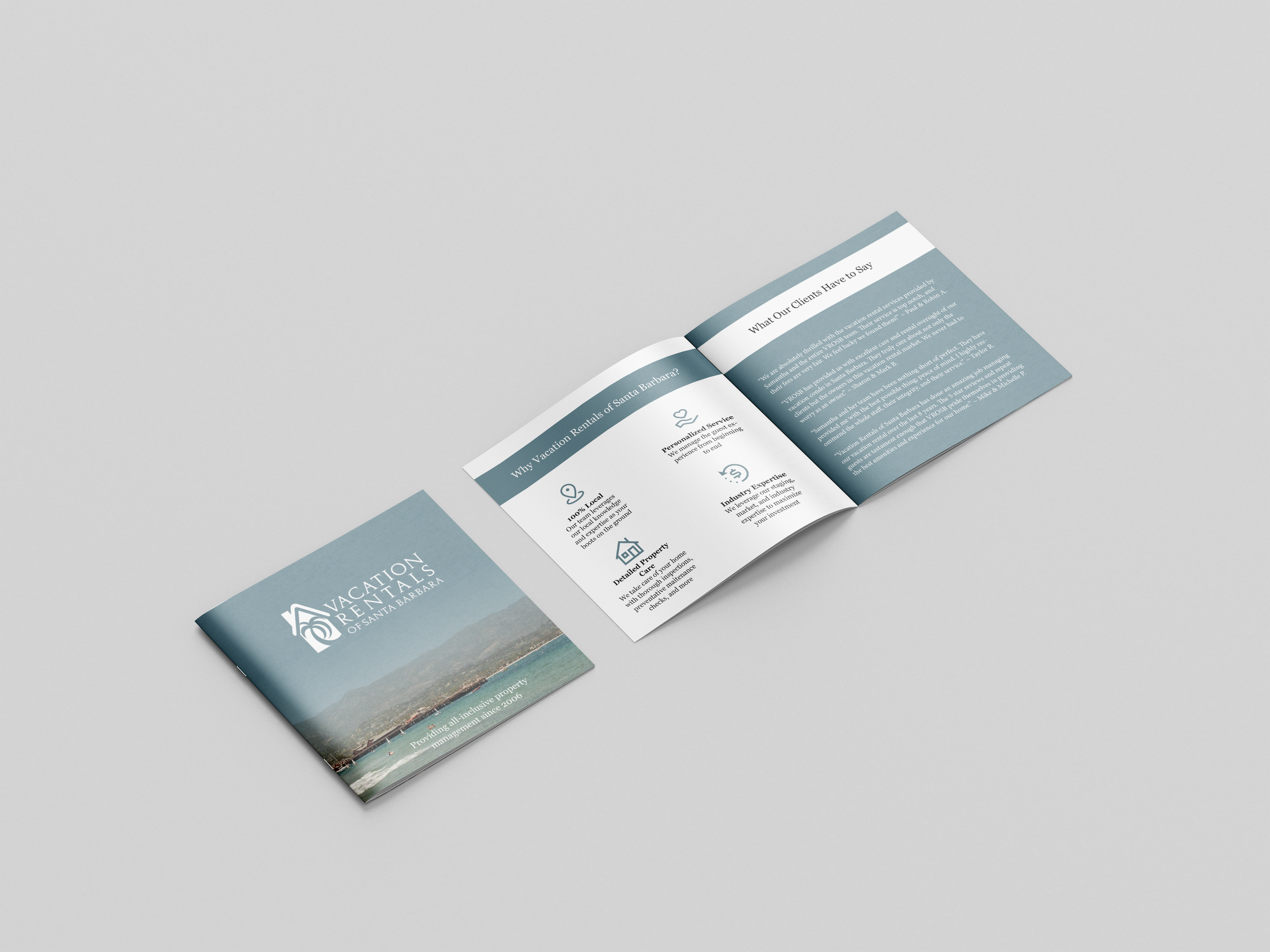 The primary focus for this project was to ensure cohesion of the existing brand identity and the new materials needed to propel the brand forward. The new materials needed to have the same look and feel as the established brand and website, and ensure that they were easily recognizable as Vacation Rentals of Santa Barbara. They needed to be fresh and revitalized, while seamlessly blending in with the existing brand.